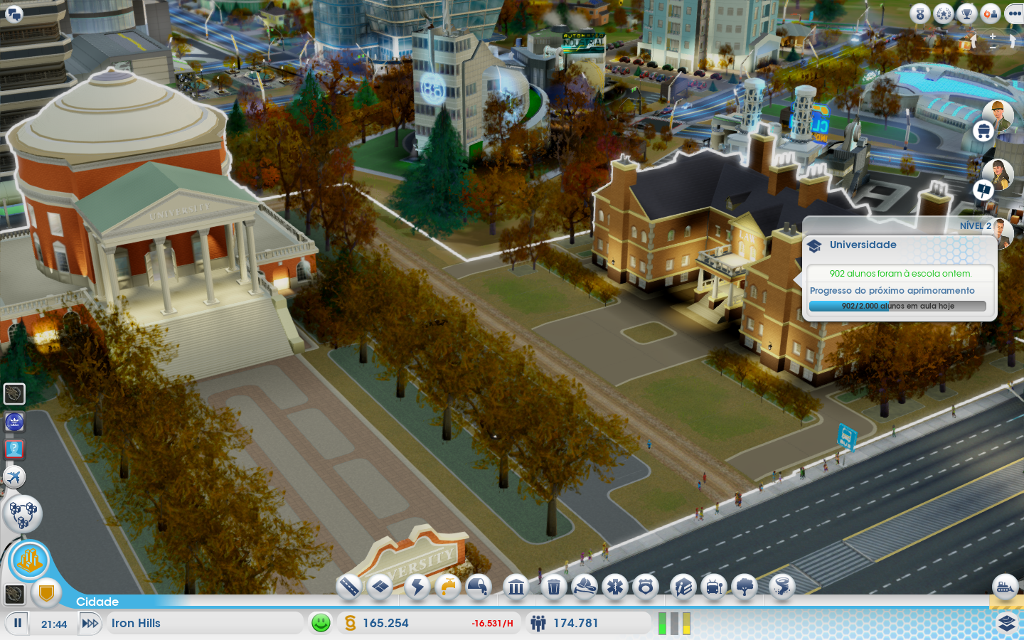 Mas não se esqueça de cuidar de seus habitantes. O bem estar deles traz maior retorno com impostos e evolui sua cidade. Para deixa-los felizes é necessário prover diversos serviços a eles. No mínimo, energia, água e limpeza, e posteriormente educação, saúde, segurança e bem-estar. Agradar a todos é complicado, ainda mais que não depende só de dinheiro. Vamos analisar as básicas por tópicos:Energia: Prover energia é o mínimo para operação de todos os outros prédios. Mas muito cuidado onde vai colocar sua usina. Inicialmente você só pode utilizar combustíveis fósseis como fonte, então vai gerar poluição. Cada cidade tem uma direção de vento diferente, e se você colocar a usina na direção errada vai acabar jogando fumaça em cima dos moradores. Isso influencia tanto a saúde como o valor de suas residências. Posteriormente novas opções são liberadas, como usinas eólicas.