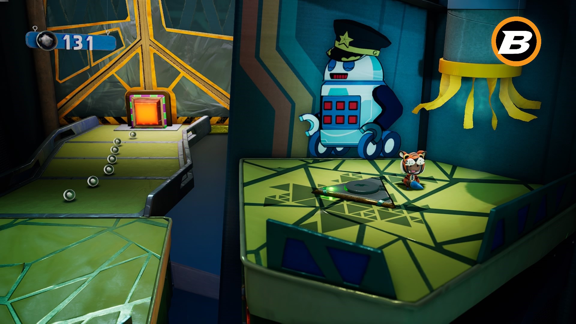 Ao chegar no quarto checkpoint (excluindo o respawn inicial) você notará dois balões explosivos pretos atrás de um inimigo que lança dardos teleguiados. Elimine-o, pegue uma bomba para explodir as caixas que estão acima de um rádio na parede e um novo engradado menor cairá na esteira rosa. Pegue outra bomba rapidamente e exploda antes que caia fora do limite. Lá dentro está o guarda-chuva de drinque.