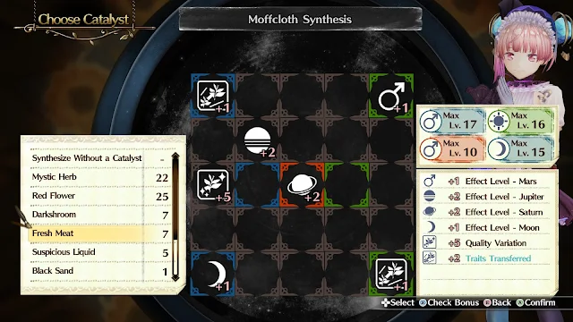 Em termos dos sistemas principais do jogo, a alquimia é bem similar à de Sophie. Ainda é necessário realizar o encaixe de itens, mas quanto mais o jogador produz um determinado item, maior é o nível de proficiência nele, abrindo a possibilidade de girar os materiais na hora de produzi-lo. No lugar de caldeirões, o jogador pode utilizar alguns itens como catalisadores para mudar a disposição dos bônus no tabuleiro, que são fixos em vez de baseados no posicionamento consecutivo de materiais.