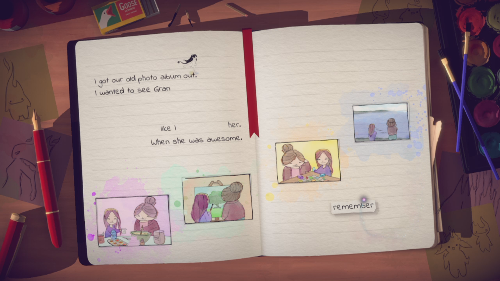As palavras não apenas servem como apoio, mas também são usadas para interagirmos com elementos e desenhos no diário e chegarmos à próxima página, servindo ao propósito de seu significado. Por exemplo: interagir com a palavra “blow” (soprar) apaga as velas do bolo desenhado, enquanto a palavra “remember” (lembrar) colore a imagem de fotos de avó e neta coladas pelas folhas. Conforme Izzy relata seu dia e suas memórias, as páginas do caderno se transformam em belos cenários e desenhos.