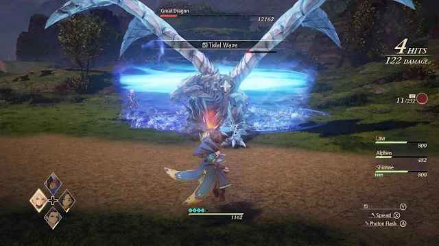 Cada um dos seis heróis oferece estilos de jogo distintos, e até mesmo a maga Rinwell apresenta habilidades ofensivas notáveis. Alphen, por exemplo, pode sacrificar um pouco de sua vida para desferir golpes poderosos com sua Espada Flamejante. Shionne ataca à distância com feitiços e um rifle. Dohalim demanda observar o inimigo e esquivar na hora certa para fortalecer seu bastão. Joguei a maior parte do tempo com Alphen, mas me surpreendi com a complexidade dos sistemas dos outros personagens. Vários outros detalhes e habilidades são liberados aos poucos, o que mantém constantemente a sensação de novidade.