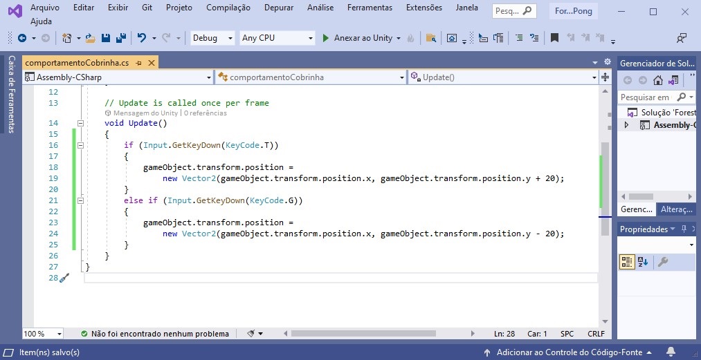 A movimentação está bem mais fluida agora, porém muito mais acelerada. Pare a simulação e volte ao Visual Studio para corrigirmos isso, modificando no código do script as entradas que movimentam 20 unidades no eixo Y por 1 unidade: