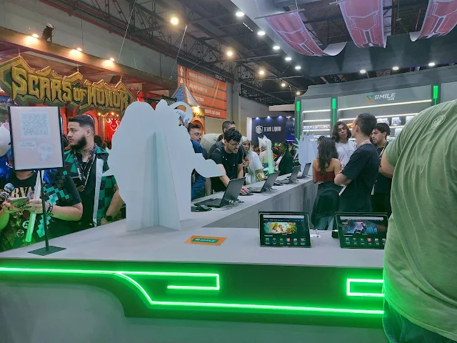Apesar disso, a decoração do espaço é tematizada ao redor da aventura mais recente no Luofu do Xianzhou; ocorreu aqui uma desconexão fundamental, diferentemente do estande de Genshin Impact, que apresentou personagens de Natlan em uma área de Natlan. Yunli e Moze só estavam presentes em forma de papelão, não dentro do jogo, o que me pareceu um desperdício.